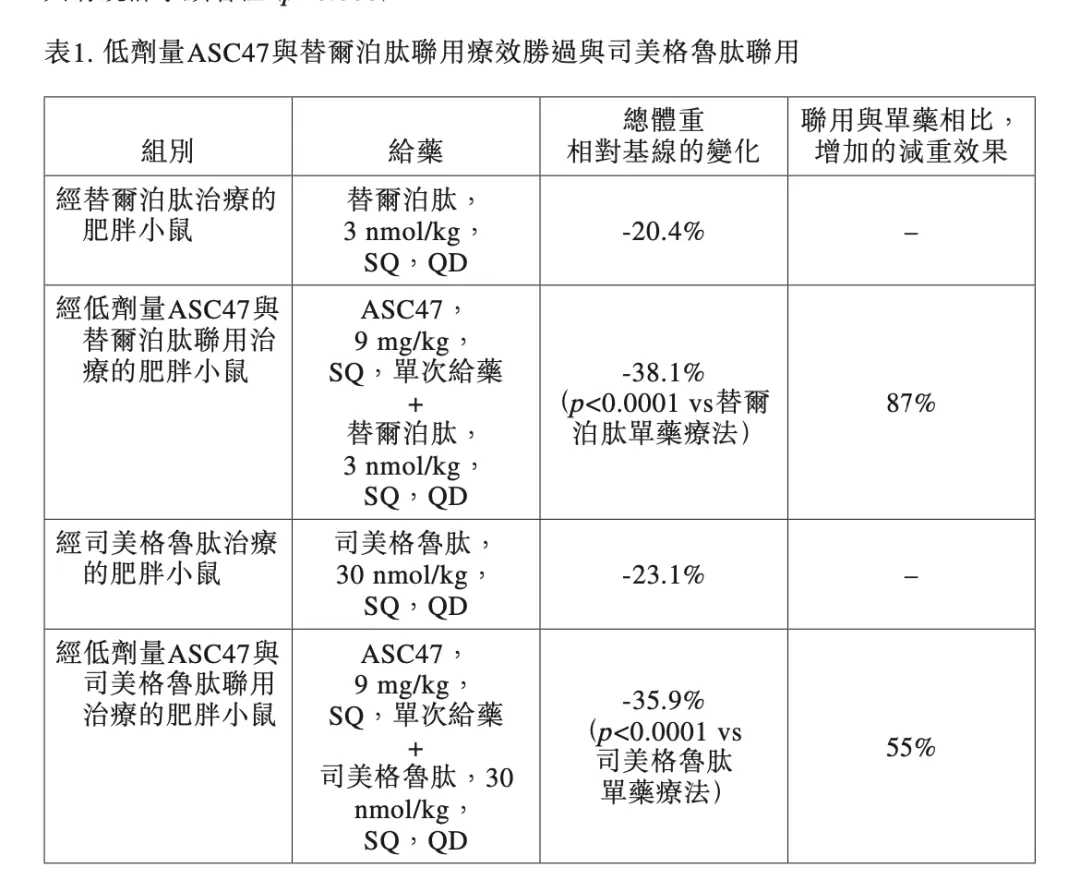如下表所示,ASC47和替尔泊肽联用,相对于单用替尔泊肽相比,减重效果要高87%。而ASC47与司美格鲁肽联用,与司美格鲁肽单药使用相比,减重效果要高55%。