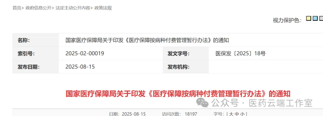 8月15日,国家医保局发出《医疗保障按病种付费管理暂行办法》的通知(医保发〔2025〕18号),该通知的出台,对于医疗机构比较关心的按病种付费的相关政策进行了明确,稳定医疗机构对总额指标的预期,技术标准优化更加明确,配套措施建设更加完善,基金结算更加体现赋能。