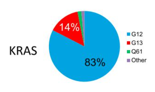 KRAS最常见的突变位点是G12(占到所有突变位点的83%),主要突变类型有G12D(33%)、G12V(23%)、G12C(11%)和G13D(12%)。