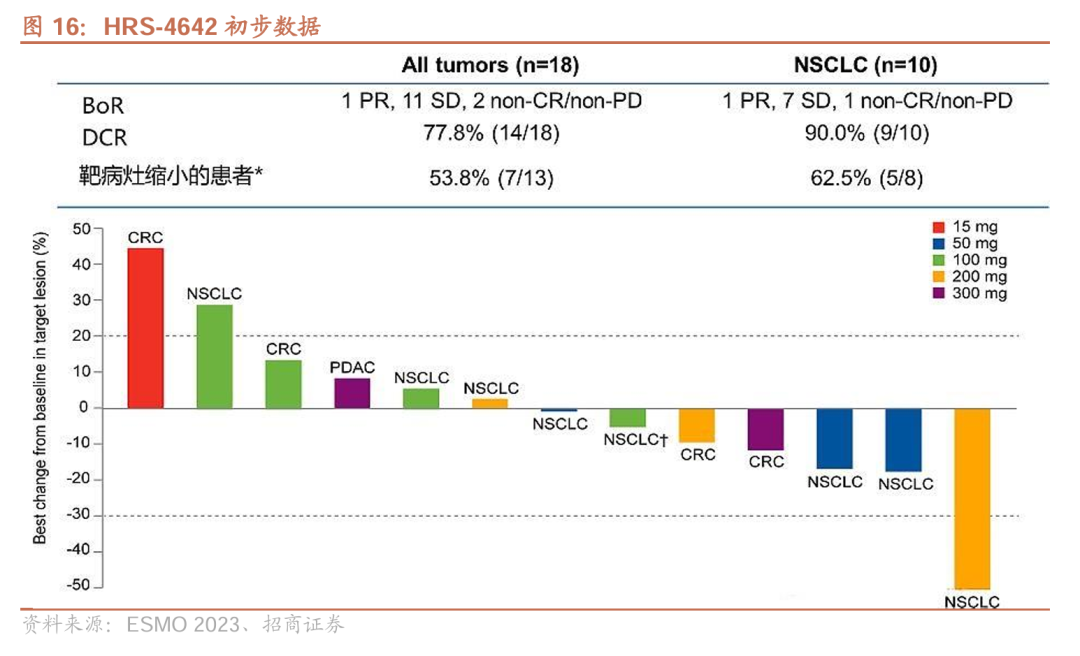 恒瑞医药早在2023 ESMO药公布HRS-4642的初步数据,研究共纳入18例患者(包括10例肺腺癌患者、5例结直肠癌等,中位治疗线数为3,Q2W),18例患者共有11例患者(61.1%)病情稳定,6例(33.3%)靶病灶缩小。