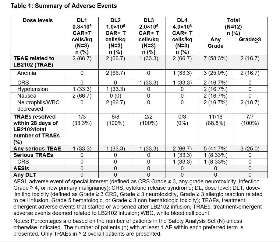 7例患者出现治疗相关不良事件(TRAE),5例出现严重不良事件(SAE),2例出现1级细胞因子释放综合征(CRS)。在0.3-16.0×10E6 CAR+T细胞/kg剂量范围内,未见报告DLT或神经毒性。