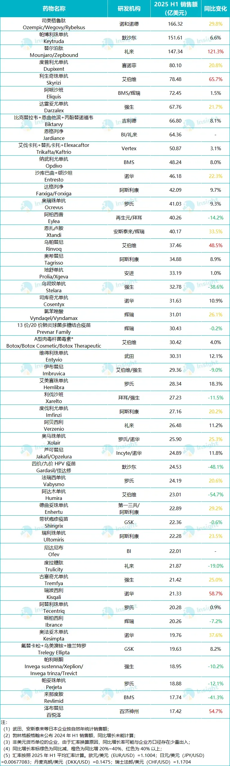 (图片来源:Insight 数据库《2025 上半年 TOP50 药品销售额榜单(亿美元)》)