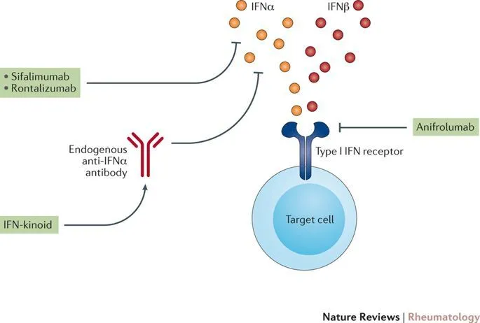受体),是参与调控SLE炎症通路的细胞因子,在其病理生理学中起着核心作用,I型干扰素受体信号的增加与疾病活动度和严重程度增加相关。