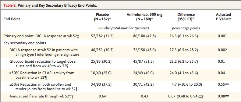 TULIP-2试验中阿伏利尤单抗显著改善了基于BILAG的狼疮综合评价指数(BICLA)