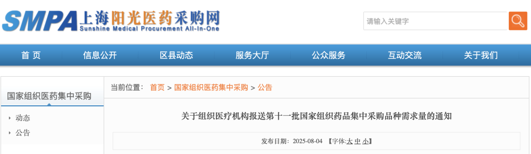 近日,国采办发布《关于组织医疗机构报送第十一批国家组织药品集中采购品种需求量的通知》,于8月6日至25日开展第十一批药品集采医疗机构需求量填报工作。医疗机构按要求填报相关药品采购需求量,并于8月25日24:00前提交数据。