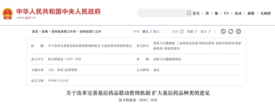 2024年11月14日,国家卫健委 国家医保局等六部门发布《关于改革完善基层药品联动管理机制
