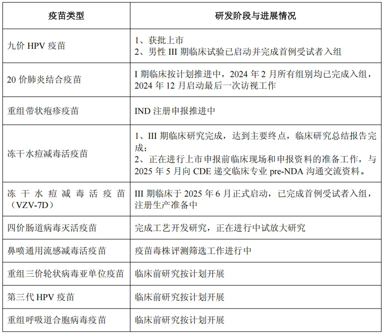 此外,公司在研的20价肺炎结合疫苗、重组带状疱疹病毒疫苗、重组三价轮状病毒亚单位疫苗、重组呼吸道合胞病毒疫苗、冻干水痘减毒活疫苗、冻干水痘减毒活疫苗(VZV-7D)和鼻喷通用流感疫苗等多个新管线均按计划有序推进中。以下为报告期内,公司疫苗管线研发进展: