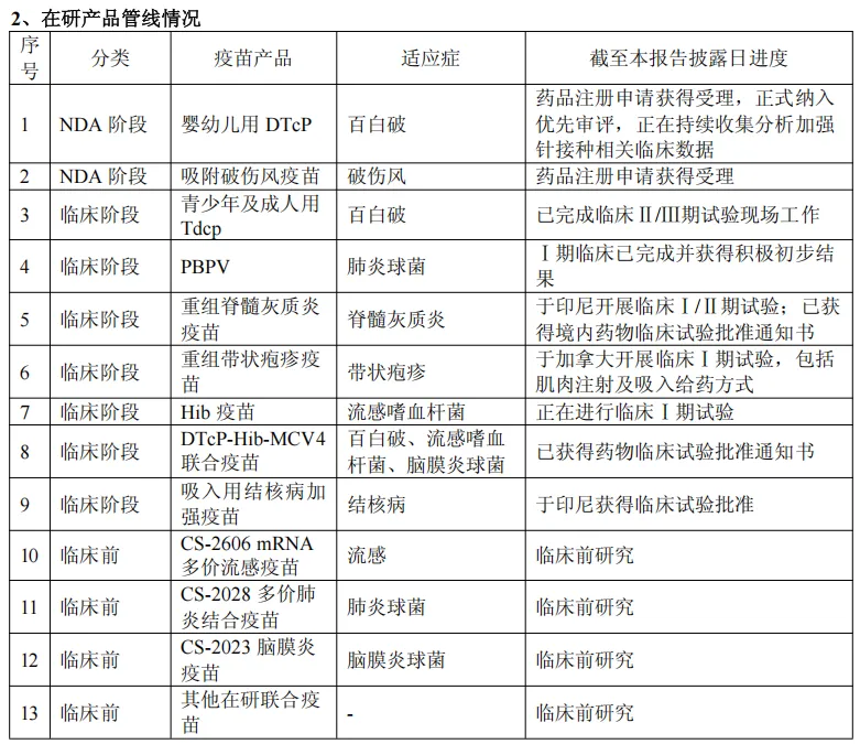 13价肺炎结合疫苗:2025年6月,公司的PCV13i优佩欣®获得国家药品监督管理局下发的《药品注册证书》,该产品为公司肺炎产品组合中首个获得药品注册证书的产品,为公司更高价肺炎结合疫苗的研发奠定基础。