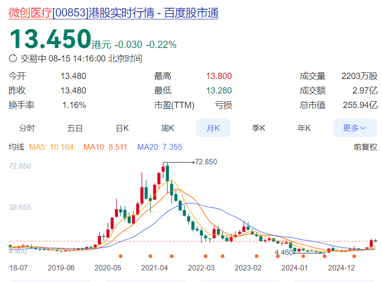 ▲微创医疗股价,数据来源:百度股市通