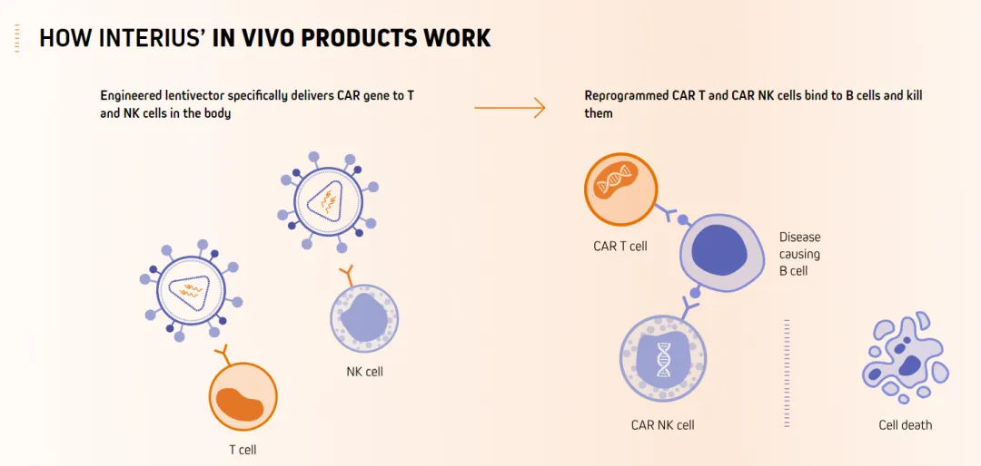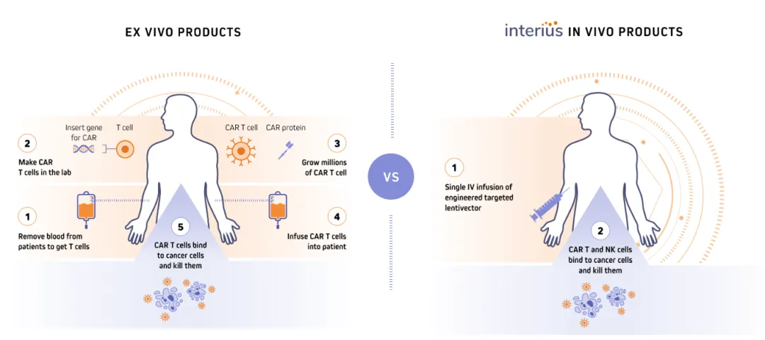 此次收购通过整合Interius的体内集成平台,补充了Kite在细胞治疗方面的专业知识。这种方法可以直接在患者体内产生CAR-T细胞,并通过将DNA插入患者的基因组中提供更持久和持久的治疗效果。与需要细胞采集、工程化和再融合的传统CAR-T疗法不同,Interius的创新、现成但个性化的方法旨在通过单次静脉输注提供,消除了预处理化疗和复杂细胞处理的需要。