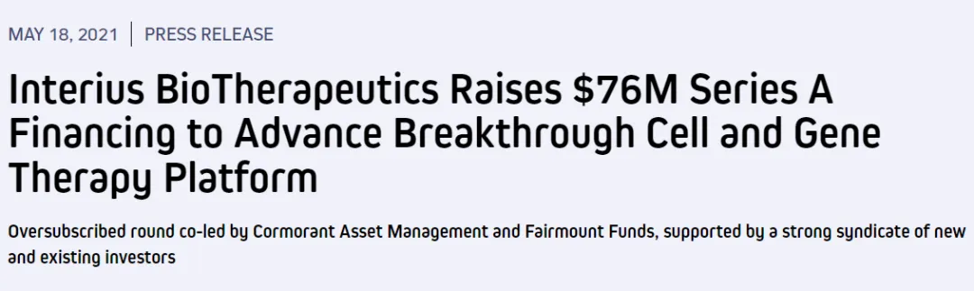 2021年5月18日,Interius 完成超额认购的7600万美元A轮融资,融资由Cormorant Asset