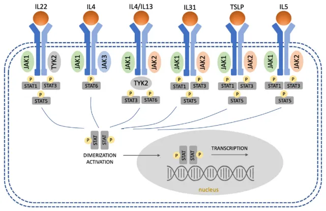 JAK抑制剂靶向JAK-STAT(信号转导和转录激活因子)通路,该通路在许多免疫介导疾病(如AD)的发病机制中起重要作用。虽然针对AD的JAK抑制剂对HE的疗效尚未完全明确,但抑制Th2通路可能对过敏性接触性皮炎有益,因为多种过敏原可引发Th2偏向的免疫反应。