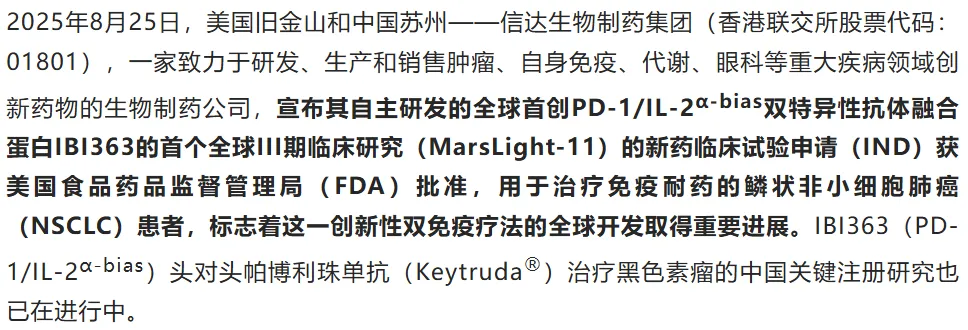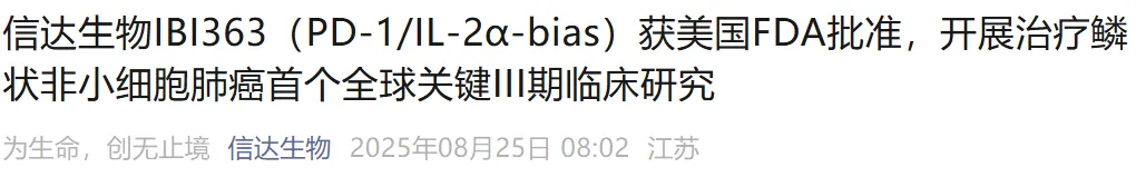 2025年8月25日,信达生物宣布PD-1/IL-2抗体融合蛋白获得美国FDA批准,开展治疗鳞状非小细胞肺癌首个全球关键三期临床研究。