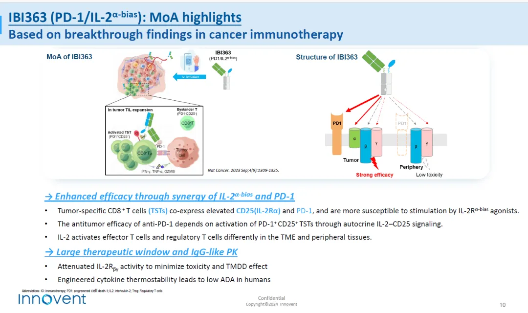 IBI363引领了肿瘤免疫赛道细胞因子领域的研发进展,分子设计上进行了独特的差异化设计,IL-2保留了对IL-2Rα的亲和力,减弱了IL-2Rβγ的活性,通过对肿瘤组织CD8