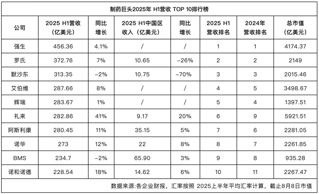 表1. 制药巨头2025 H1营收TOP10排行榜,来源:药出海