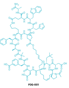 FOG-001是一款创新型肽类药物,旨在解决长期困扰肿瘤治疗的β-catenin靶点难题。Wnt信号通路的异常激活在至少15%的癌症中出现,且常与预后不良及免疫治疗耐药相关。然而,β-catenin位于细胞内部,既无法被抗体等生物大分子直接作用,也缺乏典型的小分子结合位点,因此长期被视为“不可成药”靶点。研究团队通过设计超稳定的α-螺旋肽(helicons),成功开发出FOG-001。该分子在骨架上引入多重环化结构,以保持稳定螺旋构象,并通过一系列修饰,实现脂溶性调控和细胞质暴露。同时,在与β-catenin结合的关键位点引入非天然氨基酸,使其具备皮摩尔级结合力。FOG-001能够阻断β-catenin与TCF转录因子的相互作用,从而抑制Wnt信号通路,并在依赖该通路的细胞中显著抑制增殖,而对β-catenin缺失细胞无影响。药代动力学研究显示,FOG-001具备每周给药的潜力,且避免了常见肽类药物的快速经肾清除问题。在体内实验中,它不仅有效调控AXIN2、c-MYC等下游基因,还在多种携带Wnt通路突变的患者来源移植瘤模型中实现肿瘤回缩,且耐受性良好。目前,FOG-001已进入1/2期临床试验。