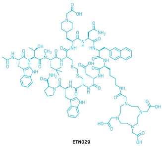 ETN029是一款新型大环肽类药物,专门靶向非典型Notch配体DLL3。DLL3在SCLC、NEPC等肿瘤细胞表面高度选择性上调,但其表达密度较低,给药物开发带来挑战。研究团队针对这一难点,设计了结合力极强且解离速率极慢的大环肽分子,以增强肿瘤结合效率。早期化合物虽具备一定的肿瘤靶向性,但存在摄取不足和肾脏聚集过高的问题。在结构优化过程中,利用复合物晶体学分析进一步完善了分子设计,获得候选药物ETN029。该分子对人DLL3具有皮摩尔级亲和力与高度特异性,在SHP-77及DLL3表达的细胞系中均表现出显著的结合和内吞作用,而在阴性对照细胞中几乎无结合。在SHP-77异种移植瘤小鼠模型中,ETN029放射性偶联物可快速富集并长时间滞留于肿瘤组织。在多个动物模型中,单次低剂量ETN029放射性偶联物即可诱导显著肿瘤回缩并延长生存期。ETN029目前正在1期临床试验中接受评估。