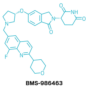 BMS-986463是一款潜在”first-in-class”的WEE1靶向蛋白降解剂。WEE1是一种关键的细胞周期调控激酶,主要功能是在S期和G2/M期阻止带有DNA损伤的细胞进入有丝分裂。多种高复制压力的肿瘤被认为高度依赖WEE1生存,因此成为颇具吸引力的抗癌靶点。研究团队基于专有CELMoD分子库,筛选并优化出多个WEE1降解剂化合物,并结合结构导向设计,解析了WEE1-CRBN-DDB1三元复合物结构,从而获得高效且选择性极佳的候选分子。在小鼠与大鼠异种移植瘤模型中,BMS-986463表现出显著的抑瘤效果,并建立了清晰的药代、药效与疗效关系,伴随持续的WEE1降解和磷酸化CDK2降低。目前,BMS-986463已进入1期临床试验,针对多种晚期实体瘤展开评估。