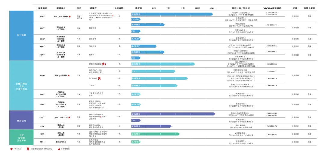 自成立以来,宝济药业已打造出涵盖四个治疗领域的自研管线,由七款处于临床阶段的候选药物(包括我们的三款核心产品KJ017、KJ103及SJ02)及五项临床前资产组成。