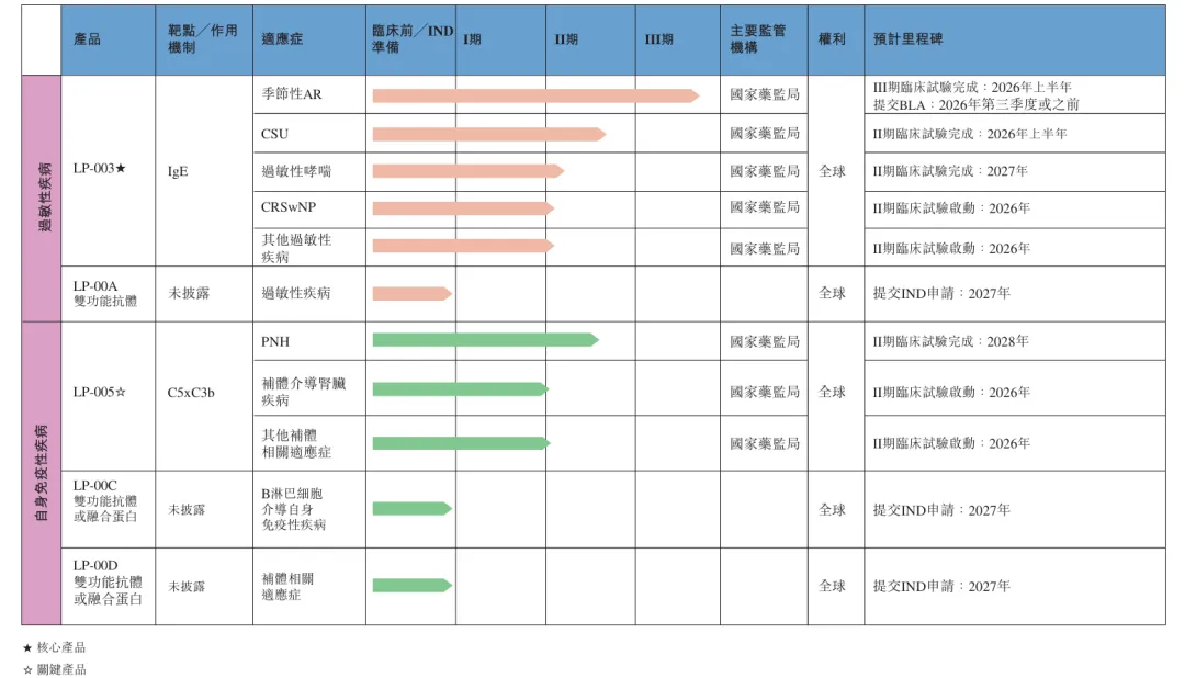 关键产品LP-005则是一种全新设计及具有全球领先潜力的靶向C5及C3b补体的双功能抗体融合蛋白,用于治疗阵发性睡眠性血红蛋白尿症(PNH)、补体介导肾脏疾病(包括IgA肾病(IgAN)、C3肾小球病(C3G)及狼疮性肾病或狼疮性肾炎(LN))以及全身型重症肌无力(gMG)、抗MAG周围神经病变(MAG-PN)和肌萎缩侧索硬化症(ALS)。