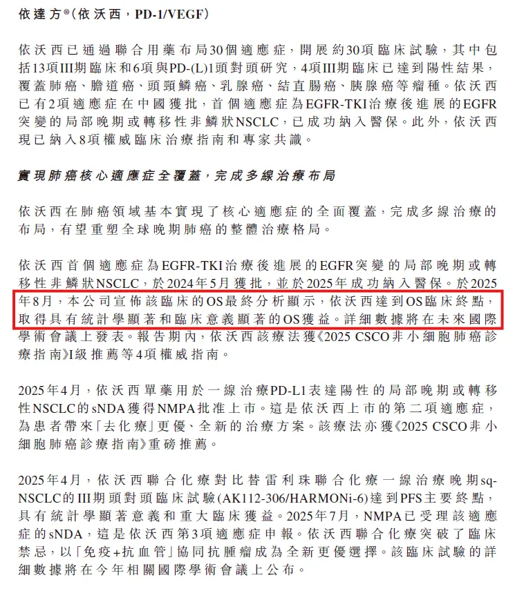 尤其重要的是,依沃西单抗(AK112)于2024年5月获得国家药品监督管理局的批准,用于EGFR-TKI治疗进展的局部晚期或转移性非鳞状非小细胞肺癌(nsq-NSCLC),针对该适应症的中国III期HARMONi-A研究(AK112-301)已达到总生存期(OS)临床终点,展现出具有统计学和临床意义的OS获益,详细数据将在未来国际学术会议上发表。