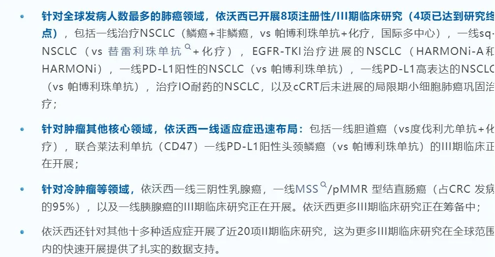 在不断证明自身重大临床价值和迭代临床标准疗法的同时,依沃西也在不断拓展在肿瘤免疫核心适应症的布局: