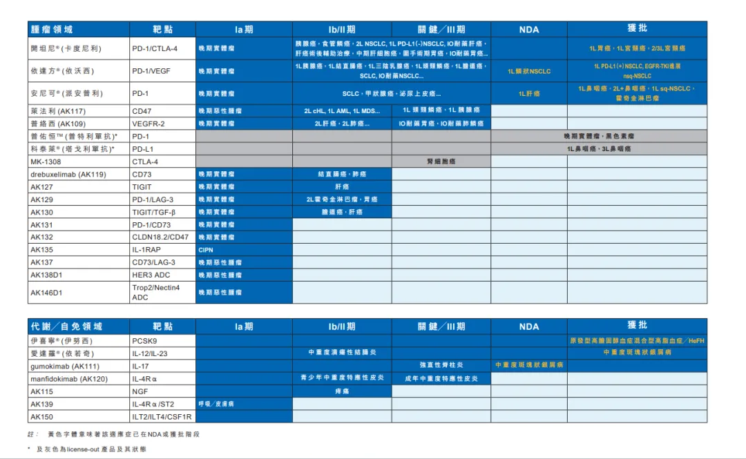 报告期内,公司其他肿瘤药物也取得了多项重要里程碑发展:公司自研新一代CD47单抗莱法利单抗(AK117)目前已与卡度尼利和依沃西等药物开展了多个肿瘤领域的临床研究,包括2个实体瘤的III期临床研究,莱法利单抗在血液瘤领域的全球临床开发也在高效开展;公司自研肿瘤新药普络西单抗(VEGFR-2)也已联合卡度尼利等药物开展了多项临床研究,包括正在筹备的或已经开展的III期临床研究。