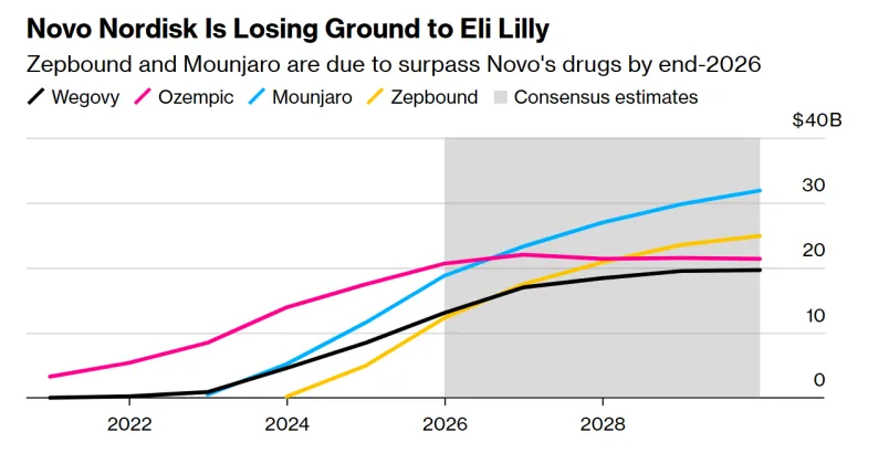 把两家合计放在两个端点比较,2025年诺和诺德领先25亿美元,2029年则变为礼来领先158亿美元,四年间“净差摆动”达到183亿美元。换句话说,其不仅在2026年完成易位,而且在随后的3个年度被逐年压实,到2029年体现在总额上为礼来比诺和诺德高约38.5%。