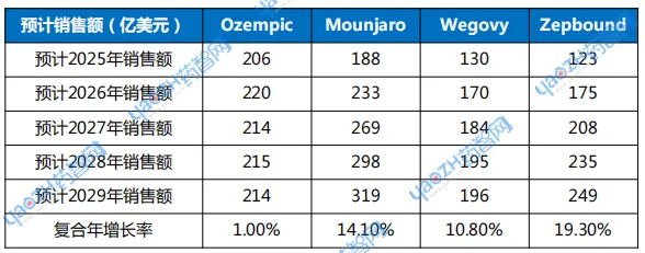 表1 Wegovy,Ozempic,Mounjaro,Zepbound在2025-2029年销售额预测
