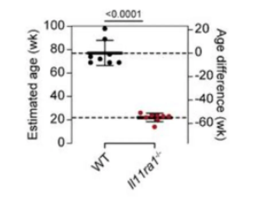 这项研究的论文在2023年发表,其中写到了与生物年龄最密切相关的生物标志物包括表观遗传时钟、端粒长度和线粒体DNA (mtDNA) 拷贝数,之后,研究者使用使用肝脏特异性表观遗传时钟来预测两岁IL-11RA1 -/-和野生型小鼠的实际年龄,看看IL-11RA缺失是否能延缓衰老。结果估计,IL-11RA1 -/-基因型的小鼠比野生型小鼠的实际年龄年轻55 周,如图所示,差异非常明显。