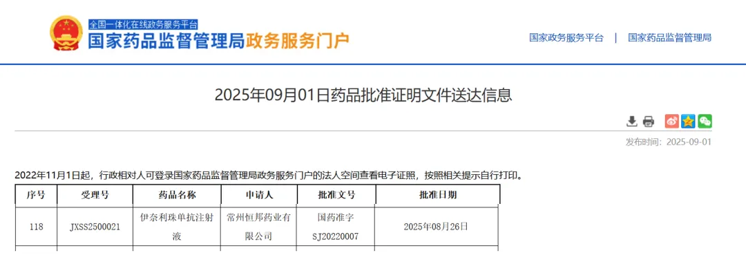 2025年 9 月 1 日,国家药监局官网更新显示:伊奈利珠单抗注射液(通用名 inebilizumab)正式获批新适应症,用于治疗免疫球蛋白 G4 相关性疾病(IgG4-RD)。