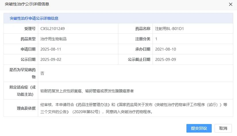9 月 2 日,CDE 官网显示,百利天恒注射用 BL-B01D1 拟纳入突破性疗法,用于铂耐药复发上皮性卵巢癌、输卵管癌或原发性腹膜癌患者。