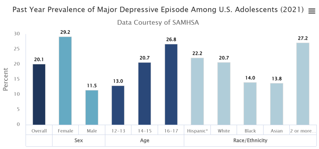 据估计,美国有500万12至17岁的青少年至少有一次重度抑郁发作。这一数字占美国12至17岁人口的20.1%。