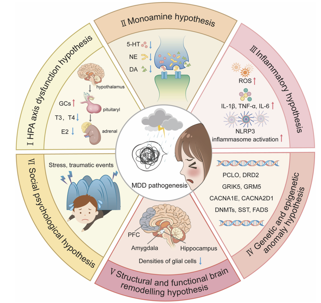 由于抑郁症(MDD)的发病机制复杂,准确的诊断方法和药物治疗策略相对有限。为了解释抑郁症的发病机制,提出了几种假说,包括:(i)下丘脑-垂体-肾上腺(HPA)轴功能障碍假说,(ii)单胺假说,(iii)炎症假说,(iv)遗传和表观遗传异常假说,(v)大脑结构和功能重塑假说,以及(vi)社会心理假说(图3)[4]。