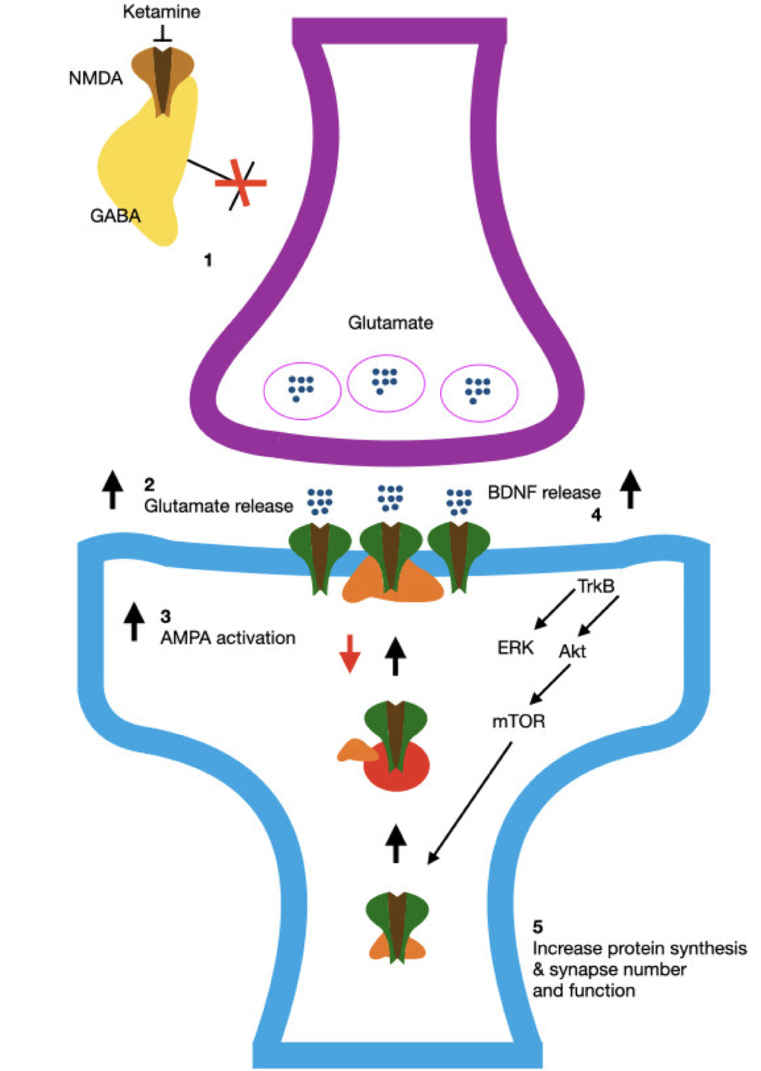 艾司氯胺酮(Esketamine)是氯胺酮的右旋异构体,具有更高的效价,通过阻断NMDA受体,增加谷氨酸的释放,激活AMPA受体,促进神经营养因子(如BDNF)的产生,从而增强突触可塑性和神经再生(图4)[6]。