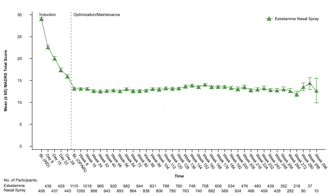 艾司氯胺酮的SUSTAIN-3试验结果显示:在诱导治疗期间,蒙哥马利-阿斯伯格抑郁量表(MADRS)总分有所下降,且这种下降在优化/维持治疗期间得以维持(各阶段基线至阶段终点的平均[标准差]变化:诱导期:-12.8[9.73];优化/维持期:+0.2[9.93])。在诱导治疗终点时,有35.6%的参与者达到缓解;在第112周和优化/维持治疗终点时,分别有48.5%和49.6%的参与者达到缓解(图5)[7]。