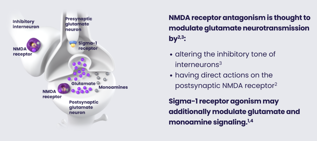 Auvelity是一种固定剂量的复方缓释片,主要成分包括氢溴酸右美沙芬(45mg)和盐酸安非他酮(105mg),右美沙芬作为NMDA受体拮抗剂和σ-1受体激动剂,调节谷氨酸能神经传递,具有抗惊厥和神经保护作用,还能阻断血清素和多巴胺的再摄取;安非他酮抑制CYP2D6酶,延长右美沙芬的半衰期,从而增强其效果(图6)。