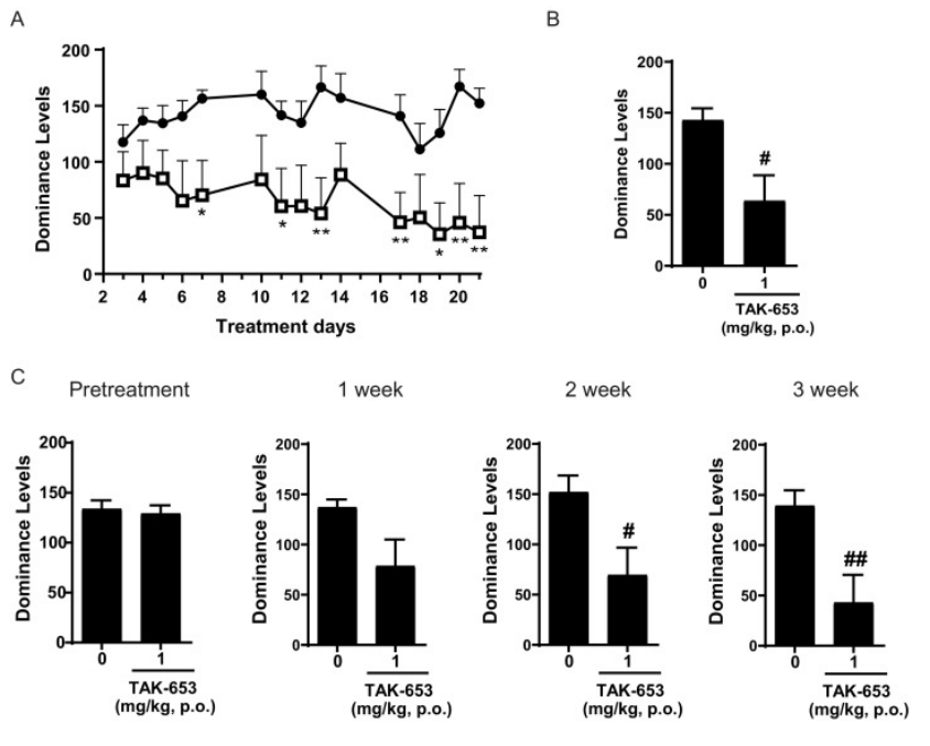 临床前研究显示:Osavampator在大鼠强迫游泳行为模型(RSBM)中,经过6天的给药后,产生了显著的抗抑郁样效应。然而,与氯胺酮不同的是,TAK-653并未在大鼠中诱导出过度运动行为,而这种行为是与人类精神分裂样副作用相关的行为指标。因此,TAK-653可能是一种具有改善安全性潜力的药物,可用于治疗包括难治性抑郁症(TRD)在内的重度抑郁症(图11)[10]。