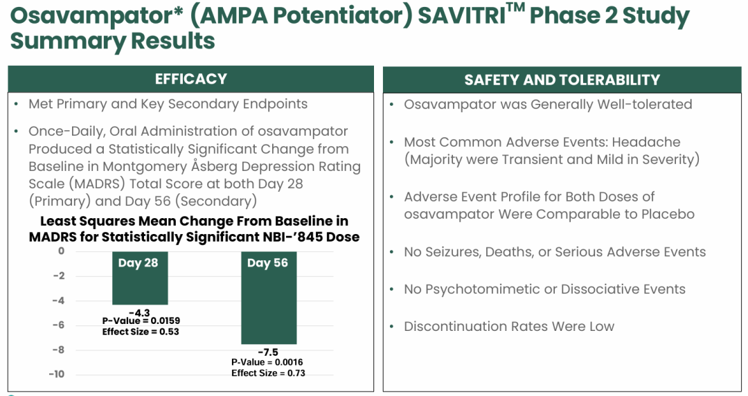2024年4月,Neurocrine公布了osavampator在成年MDD受试者中的2期SAVITRI™研究的积极顶线数据:接受osavampator治疗的患者在第28天(主要终点)和第56天(次要终点)的蒙哥马利-阿斯伯格抑郁评分量表(MADRS)总分上均显示出统计学上显著的改善(图12)。