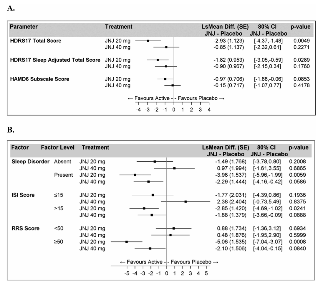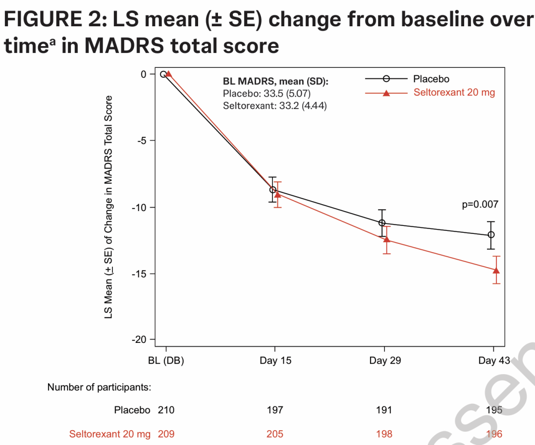 在第5周时,汉密尔顿抑郁量表17项(HDRS17)评分从基线的平均变化(标准差)在各组之间存在显著差异:Seltorexant 20mg组为-7.0(5.04),Seltorexant 40mg组为-5.5(4.34),安慰剂组为-4.4(3.67)(p=0.0456),这一差异归因于20mg组与安慰剂组之间的差异(p=0.0049)。
