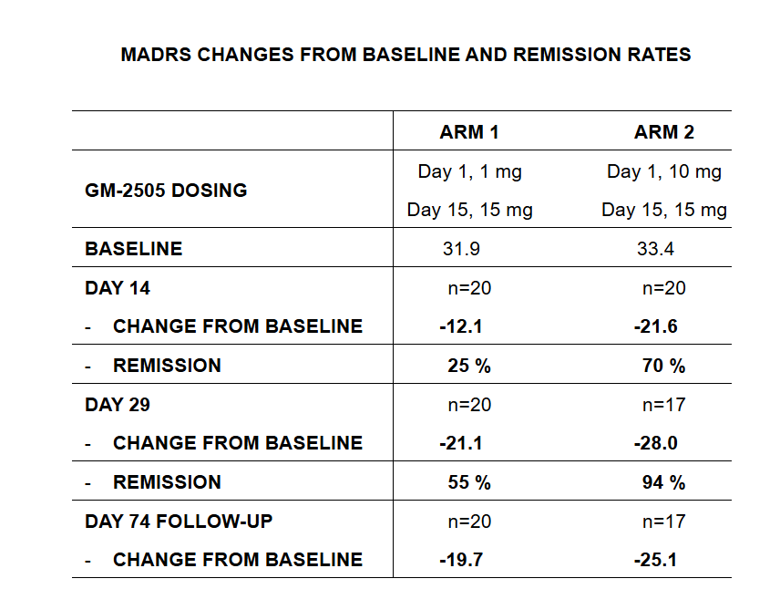 2025年2月,GH Research宣布GH001的一项用于难治性抑郁症(TRD)患者的随机、双盲、安慰剂对照2b期临床试验(GH001-TRD-201)达到了主要终点:GH001在第8天使蒙哥马利-阿斯伯格抑郁量表(MADRS)总分从基线显著降低15.2分,而安慰剂组增加了0.3分(差异为-15.5分,p<0.0001)。