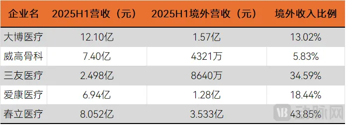 2025年H1国内上市企业出海业务表现(春立医疗为2024年年报数据)