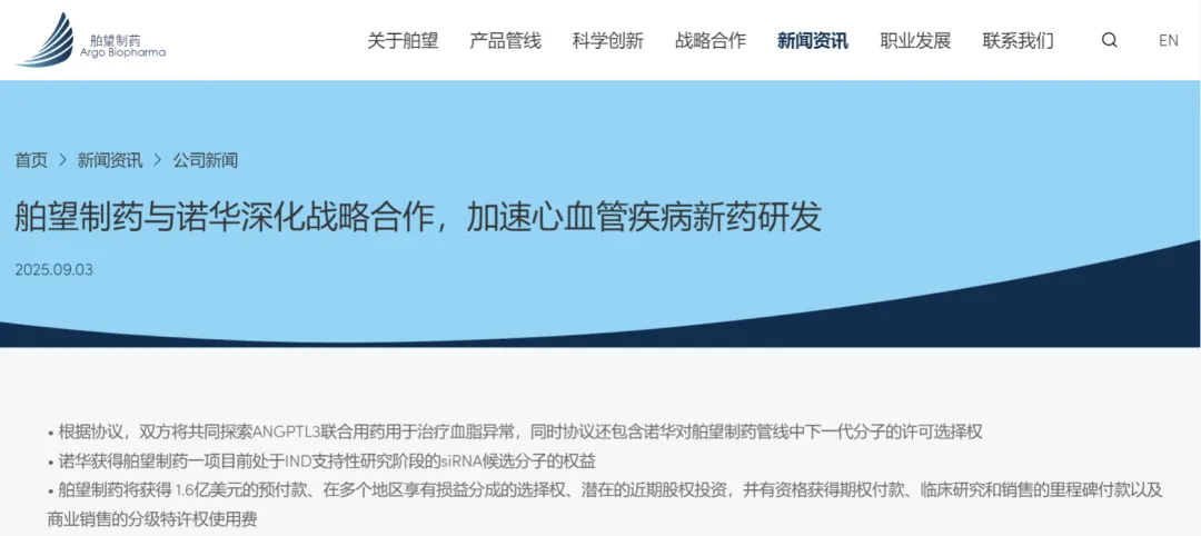 刚刚,根据舶望制药官网信息,诺华和舶望制药达成战略合作,双方共同开发多项心血管产品。 并且此次新达成的协议是在双方在去年1月份合作基础上的进一步深化合作。