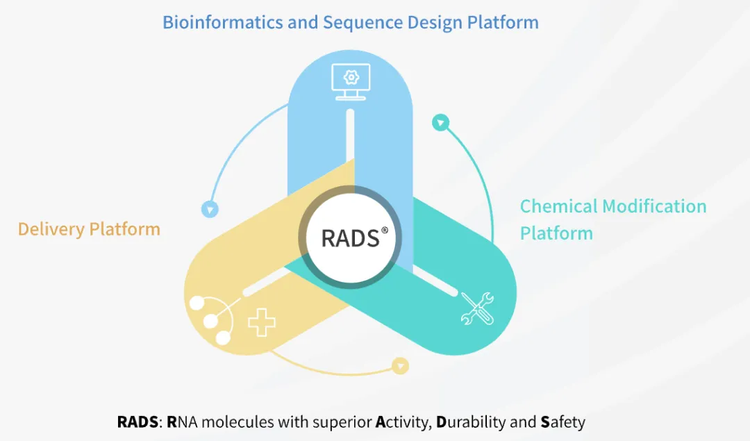 舶望制药自主研发的行业领先技术平台命名为 RADS(RNA with superior Activity, Durability, Safety),即具备“更强活性、更持久效力、更高安全性”的RNA分子平台。