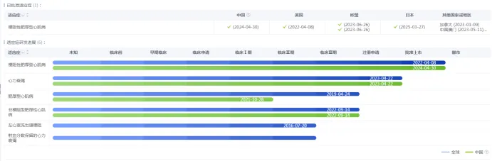 该药物目前正处于Ⅲ期临床开发阶段,用于治疗梗阻性肥厚型心肌病(oHCM),此前已获批开展用于肥厚型心肌病的临床试验,且其针对射血分数保留的心力衰竭的临床试验申请也已获得批准,而针对此适应症,国内外尚无同类药物获批上市。