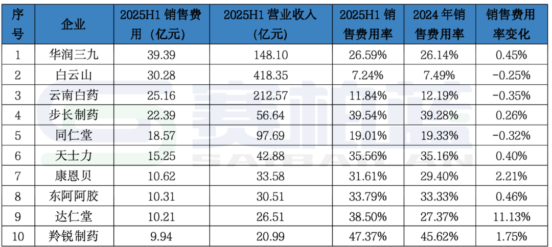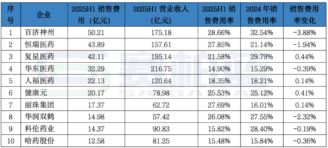 从销售费用率变化来看,A股中药II行业上市公司2025年上半年销售费用率前十企业较2024年全年下降的企业仅有三家,上升的达到7家。