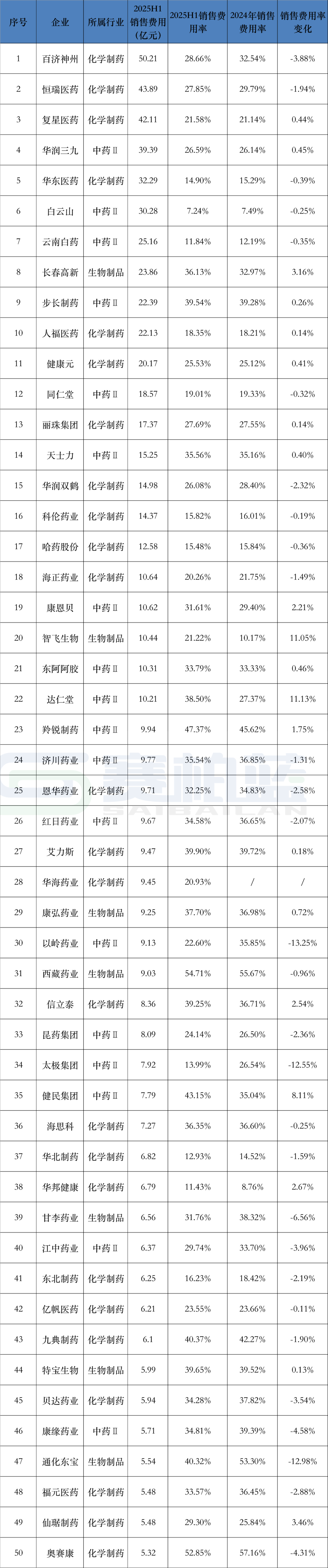 分行业来看,A股化学药制药行业统计到的上市公司154家,今年上半年销售费用合计515.94亿元,销售费用率19.10%,较2024年全年的19.67%下降0.57%;中药II统计到上市公司67家,销售费用率20.30%,较2024年全年的22.06%下降1.76%;生物制品统计到上市公司52家,销售费用率27.48%,较2024年全年的22.56%上升4.92%,主要与部分企业如智飞生物2025年营业收入同比降幅较大相关。