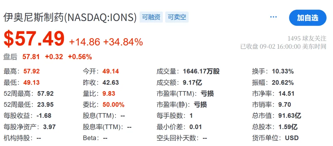 2025年9月2日,小核酸龙头Ionis宣布,其在严重高甘油三酯血症(sHTG)患者中开展的关键性3期CORE和CORE2研究取得积极结果。数据显示,其反义寡核苷酸(ASO)疗法Olezarsen可使患者的空腹甘油三酯相较安慰剂平均降低72%,急性胰腺炎事件减少85%,同时具备良好的安全性与耐受性。基于此积极结果,Ionis计划在年底前向美国FDA提交补充新药申请(sNDA)。lonis的股价也顺势暴涨近35%。