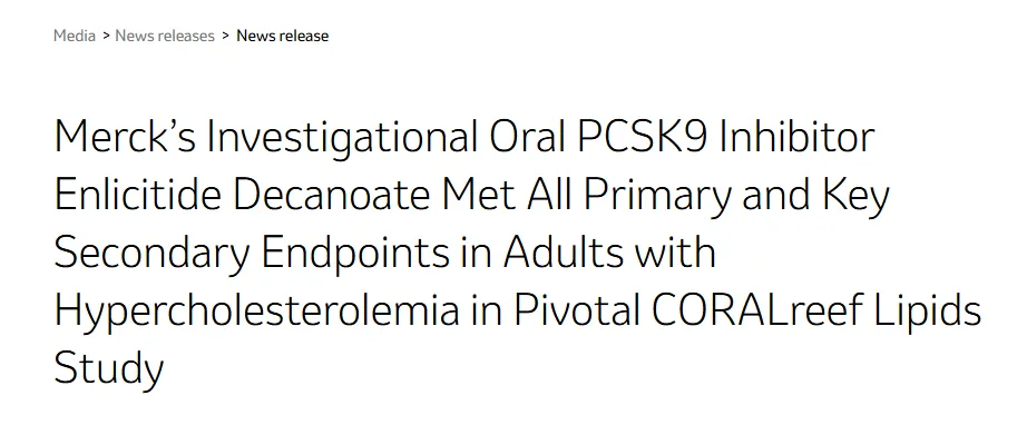 2025年9月2日,默沙东宣布Enlicitide治疗高胆固醇血症的III期CORALreef Lipids研究取得了积极结果。该研究是Enlicitide目前已完成的最大规模的III期研究。此前,该药物已顺利完成两项III期研究。