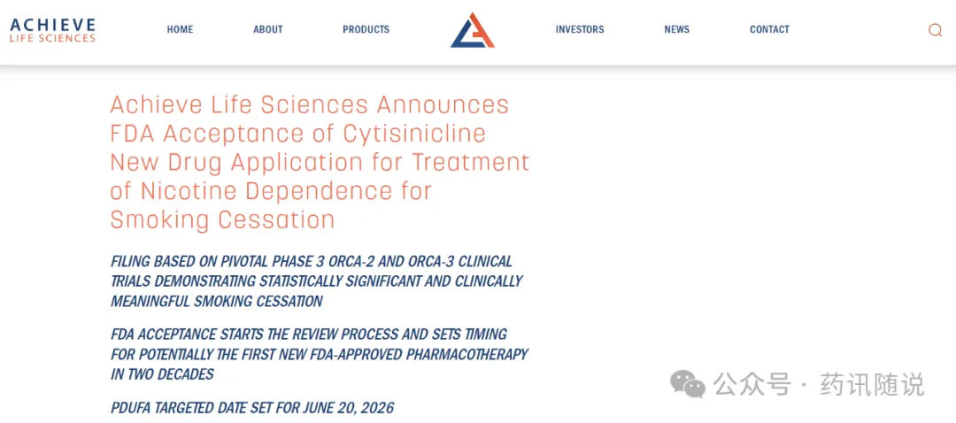 9月3日(当地时间),Achieve Life Science宣布其治疗尼古丁依赖性成人戒烟新药Cytisinicline(金雀花碱)新药上市申请(NDA)获FDA受理,PDUFA时间2026年6月20日。